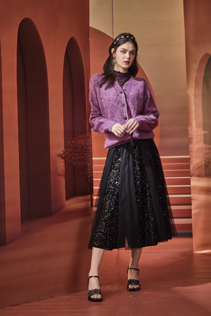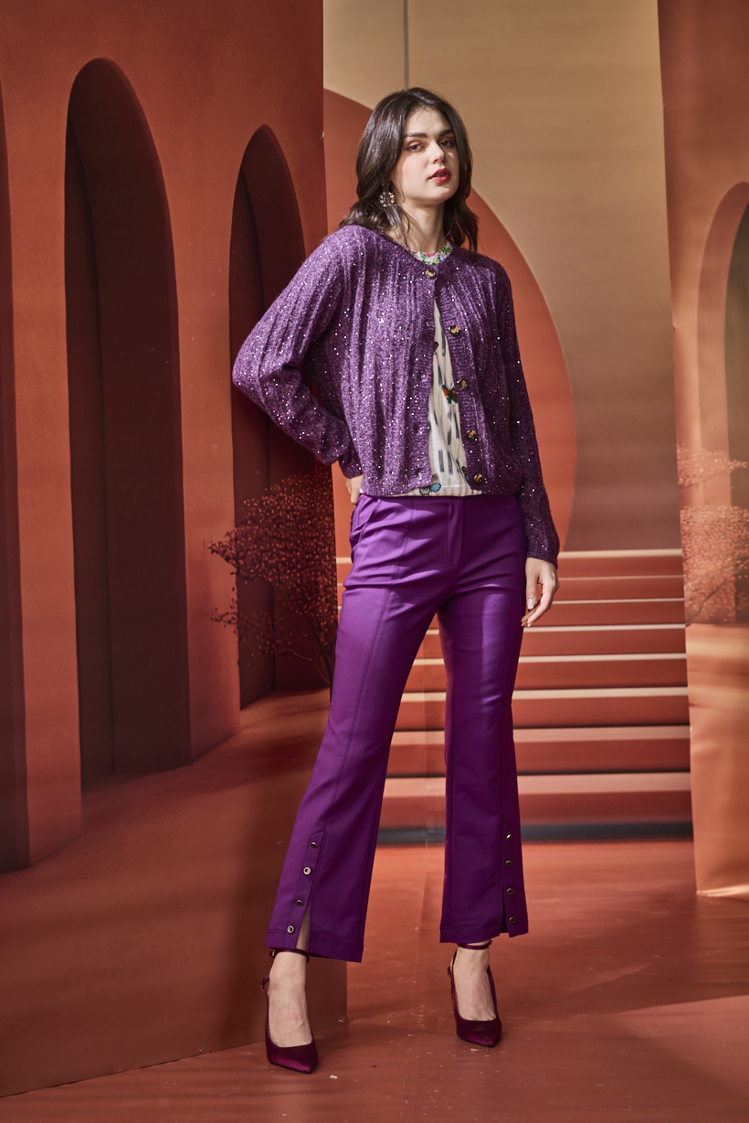 從刺繡背心、馬卡龍粉色針織,到帶亮片的紫色開襟衫,都展現了 #色彩能量感(Color Energy Dressing)。